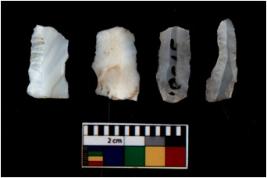 | Description / विवरण | There are n 4 flakes tool; there are flakes with sides trimmed, Marks of secondary flaking are present on the both the faces.The dorsal is relatively flat. |