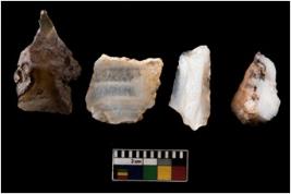 | Description / विवरण | There are n 4 ; worked utilized flakes; there are multidirectional irregular scar pattern on both dorsal and ventral face of the flakes. Two of them are tapering at one end with a point. All are having sharp edges. |