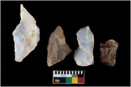 | Description / विवरण | There are n 4 ; worked utilized flakes; there are multidirectional irregular scar pattern on both dorsal and ventral face of the flakes. Three of them are tapering at one end a point. wit All are having sharp edges. |