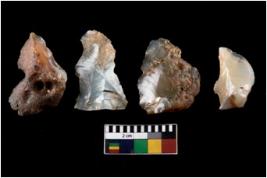 | Description / विवरण | There are n 4 ; worked utilized flakes; there are multidirectional irregular scar pattern on both dorsal and ventral face of the flakes. Three of them are tapering at one end. All are having sharp edges. |