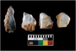 | Description / विवरण | There are n 4 ; worked utilized flakes; there are multidirectional irregular scar pattern on both dorsal and ventral face of the flakes. One of them is tapering at one end. All are having sharp edges. |