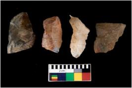 | Description / विवरण | There are n 4 ; worked utilized flakes; there are multidirectional irregular scar pattern on both dorsal and ventral face of the flakes. Two of them are tapering at one end. All are having sharp edges. |