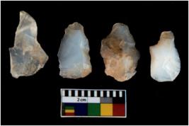 | Description / विवरण | There are n 4 utilized flake cores. There are multi directional irregular scar pattern on them. Three are tapering at one end and one has sharp edge. |