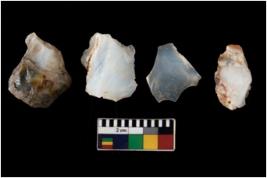 | Description / विवरण | There are n 4 ; worked utilized flakes; there are multidirectional irregular scar pattern on both dorsal and ventral face of the flakes. One of them is tapering at one end. All are having sharp edges. |