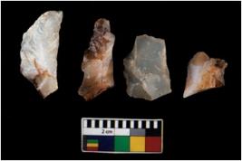 | Description / विवरण | There are n 4 ; worked utilized flakes; there are multidirectional irregular scar pattern on both dorsal and ventral face of the flakes. One of them is tapering at one end. All are having sharp edges. |