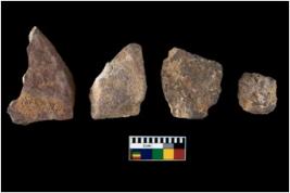 | Description / विवरण | There are n 4 utilized flake cores. There are multi directional irregular scar pattern on them. One is tapering at one end and three have sharp edges. |