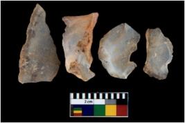 | Description / विवरण | There are n 4 utilized flake cores. There are multi directional irregular scar pattern on them. Three are tapering at one end and one has sharp edge. |