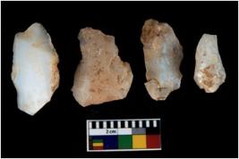 | Description / विवरण | There are n 4 utilized flake cores. There are multi directional irregular scar pattern on them. All of them are tapering at one end. |