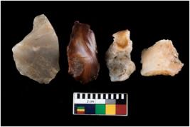 | Description / विवरण | There are n 4 ; worked utilized flakes; there are multidirectional irregular scar pattern on both dorsal and ventral face of the flakes. Two of them are tapering at one end. All are having sharp edges. |