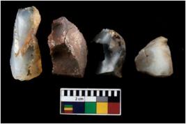 | Description / विवरण | There are n 4 ; worked utilized flakes; there are multidirectional irregular scar pattern on both dorsal and ventral face of the flakes. One of them is tapering at one end. All are having sharp edges. |