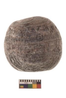 | Description / विवरण | Specimen of a spherical shaped hammer stone with battered surface |