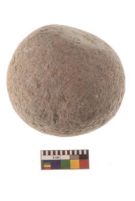 | Description / विवरण | Specimen of a hammer stone roughly rounded in shape with grounded edges and flattish base. |