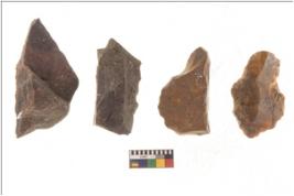 | Description / विवरण | There are n 4 flakes tool; there are large flakes with sides trimmed, Marks of secondary flaking are present on the both the faces.The dorsal is relatively flat. One is pointed functional top. |