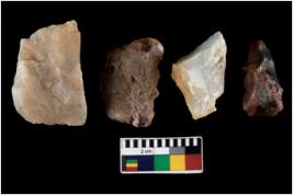 | Description / विवरण | There are n 4 ; worked utilized flakes; there are multidirectional irregular scar pattern on both dorsal and ventral face of the flakes. Two of them are tapering at one end. All are having sharp edges. |