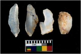 | Description / विवरण | There are n 4 utilized flake cores. There are multi directional irregular scar pattern on them. Three are tapering at one end and one has sharp edge. |