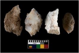 | Description / विवरण | There are n 4 ; worked utilized flakes; there are multidirectional irregular scar pattern on both dorsal and ventral face of the flakes. Three of them are tapering at one end. All are having sharp edges. |