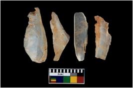 | Description / विवरण | There are n 4 utilized flake cores. There are multi directional irregular scar pattern on them. Two are tapering at one end and two have sharp edges. |