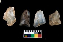 | Description / विवरण | There are n 4 ; worked utilized flakes; there are multidirectional irregular scar pattern on both dorsal and ventral face of the flakes. three of them are tapering at one end. All are having sharp edges. |