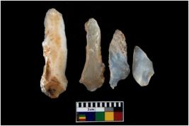 | Description / विवरण | There are n 4 utilized flake cores. There are multi directional irregular scar pattern on them. Three are tapering at one end and one has sharp edge. |