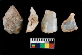 | Description / विवरण | There are n 4 ; worked utilized flakes; there are multidirectional irregular scar pattern on both dorsal and ventral face of the flakes. Two of them are tapering at one end. All are having sharp edges. |
