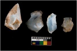 | Description / विवरण | There are n 4 ; worked utilized flakes; there are multidirectional irregular scar pattern on both dorsal and ventral face of the flakes. One of them is tapering at one end with a point. All are having sharp edges. |