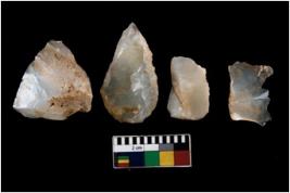 | Description / विवरण | There are n 4 ; worked utilized flakes; there are multidirectional irregular scar pattern on both dorsal and ventral face of the flakes. One of them is tapering at one end with a point. All are having sharp edges. |