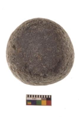 | Description / विवरण | Specimen of a hammer stone roughly rounded in shape with grounded edges and flattish base. |