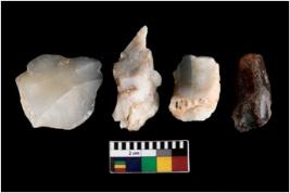 | Description / विवरण | There are n 4 ; worked utilized flakes; there are multidirectional irregular scar pattern on both dorsal and ventral face of the flakes. one of them is tapering at one end. All are having sharp edges. |