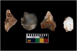 | Description / विवरण | There are n 4 ; worked utilized flakes; there are multidirectional irregular scar pattern on both dorsal and ventral face of the flakes. Two of them are tapering at one end. All are having sharp edges. |