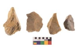 | Description / विवरण | There are n 4 flakes tool; there are multidirectional irregular scar pattern on them; made of short flakes,two have pointed top and remain have tapering edges. |