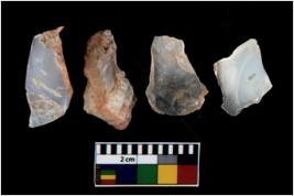 | Description / विवरण | There are n 4 utilized flake cores. There are multi directional irregular scar pattern on them. All of them are tapering at one end. |