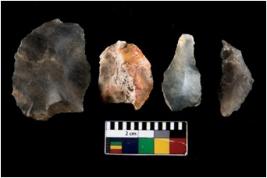| Description / विवरण | There are n 4 ; worked utilized flakes; there are multidirectional irregular scar pattern on both dorsal and ventral face of the flakes. Two of them are tapering at one end. All are having sharp edges. |