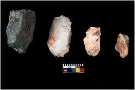| Description / विवरण | There are n 4 cores; there are multi directional irregular scar pattern on them. Some of them are tapering at one end. Most of them having blunt edges. 1 chert and 3 quartz |