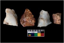| Description / विवरण | There are n 4 ; worked utilized flakes; there are multidirectional irregular scar pattern on both dorsal and ventral face of the flakes. Two of them are tapering at one end. All are having sharp edges. |