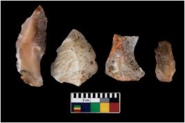 | Description / विवरण | There are n 4 ; worked utilized flakes; there are multidirectional irregular scar pattern on both dorsal and ventral face of the flakes. One of them is tapering at one end with a point. All are having sharp edges. |