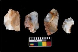 | Description / विवरण | There are n 4 ; worked utilized flakes; there are multidirectional irregular scar pattern on both dorsal and ventral face of the flakes. Two of them are tapering at one end. All are having sharp edges. |