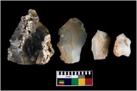 | Description / विवरण | There are n 4 ; worked utilized flakes; there are multidirectional irregular scar pattern on both dorsal and ventral face of the flakes. One of them is tapering at one end. All are having sharp edges. |