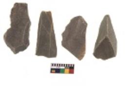 | Description / विवरण | There are n 4 utilized flake cores. There are multidirectional irregular dominant scar pattern on both dorsal and ventral face of the flake cores. Three are tapering at one end and one has sharp edges. |