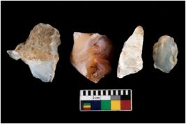 | Description / विवरण | There are n 4 ; worked utilized flakes; there are multidirectional irregular scar pattern on both dorsal and ventral face of the flakes. One of them is tapering at one end. All are having sharp edges. |