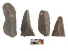 | Description / विवरण | There are n 4 utilized flake cores. There are multidirectional irregular dominant scar pattern on both dorsal and ventral face of the flake cores. Three are tapering at one end and one has sharp edges. |