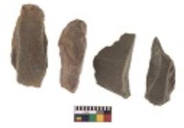| Description / विवरण | There are n 4 utilized flake cores. There are multidirectional irregular dominant scar pattern on both dorsal and ventral face of the flake cores. Three are tapering at one end and one has sharp edges. |