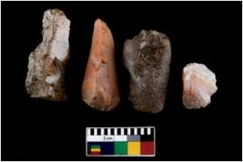 | Description / विवरण | There are n 4 ; worked utilized flakes; there are multidirectional irregular scar pattern on both dorsal and ventral face of the flakes. Two of them are tapering at one end. All are having sharp edges. |