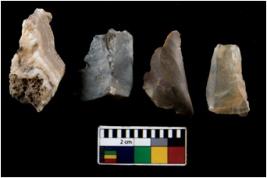 | Description / विवरण | There are n 4 ; worked utilized flakes; there are multidirectional irregular scar pattern on both dorsal and ventral face of the flakes. Three of them are tapering at one end. All are having sharp edges. |