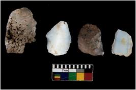 | Description / विवरण | There are n 4 ; worked utilized flakes; there are multidirectional irregular scar pattern on both dorsal and ventral face of the flakes. Two of them are tapering at one end. All are having sharp edges. |
