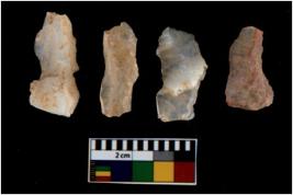 | Description / विवरण | There are n 4 utilized flake cores. There are multi directional irregular scar pattern on them. All of them are tapering at one end. |