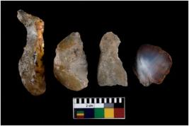 | Description / विवरण | There are n 4 ; worked utilized flakes; there are multidirectional irregular scar pattern on both dorsal and ventral face of the flakes. Three of them are tapering at one end. All are having sharp edges. |