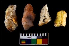 | Description / विवरण | There are n 04 objects; among them one is made up of chalcedony which is very sharp from one side and is broken. Rest are chert along with sharp edges, some are tapering at one end. |