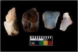 | Description / विवरण | There are n 4 ; worked utilized flakes; there are multidirectional irregular scar pattern on both dorsal and ventral face of the flakes. Two of them are tapering at one end. All are having sharp edges. |