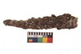 | Description / विवरण | Specimen having elongated sleek rectangular shaped body, truncated end, with uniform thickness and highly corroded surface. |