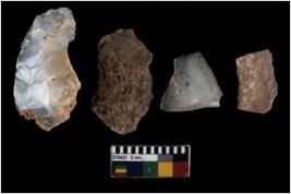 | Description / विवरण | There are n 4 ; worked utilized flakes; there are multidirectional irregular scar pattern on both dorsal and ventral face of the flakes. One of them is tapering at one end. All are having sharp edges. |